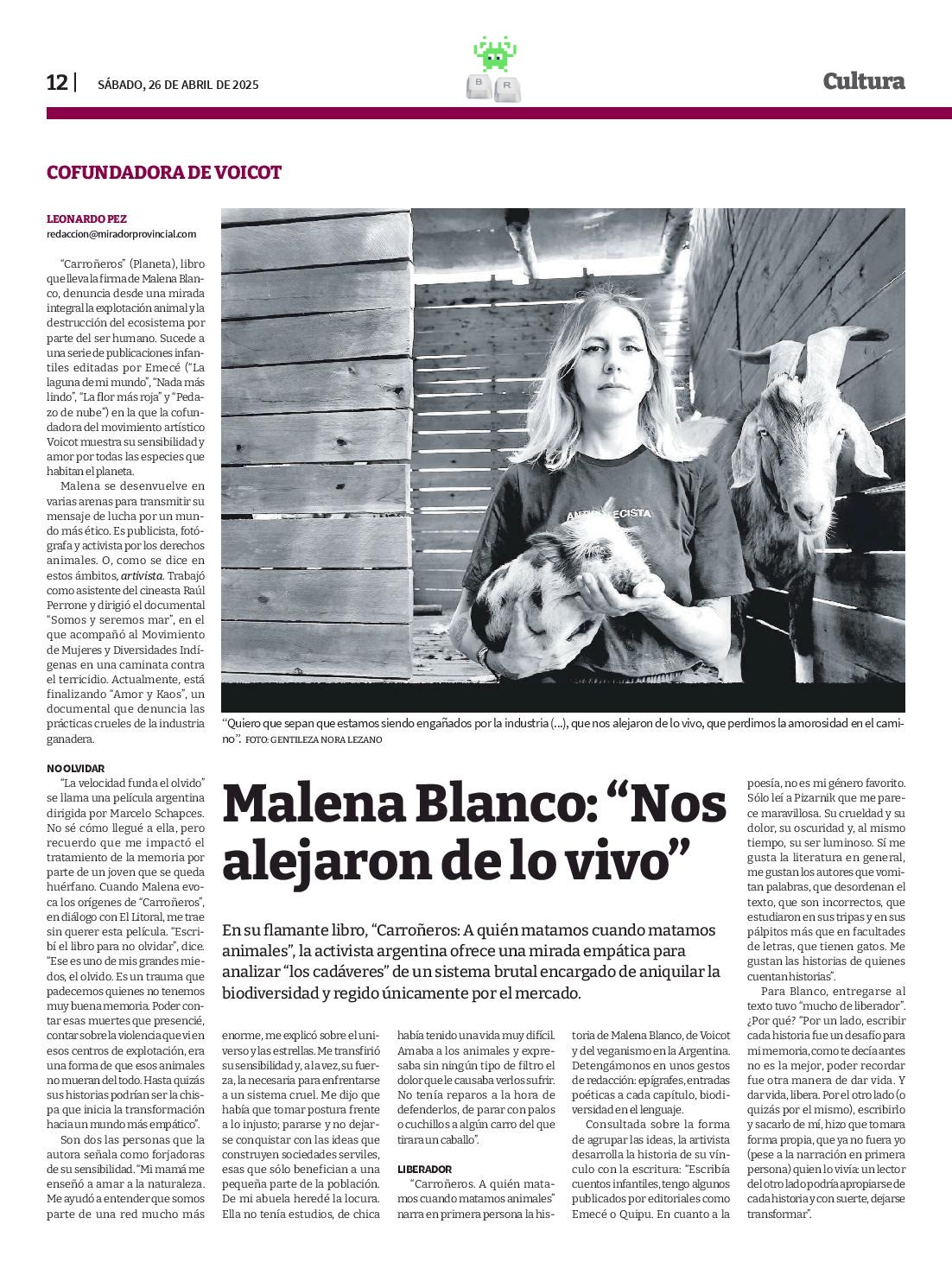 Les comparto la entrevista a Malena Blanco, cofundadora del movimiento artístico por la defensa de los derechos animales Voicot. Pueden leerla en este link.