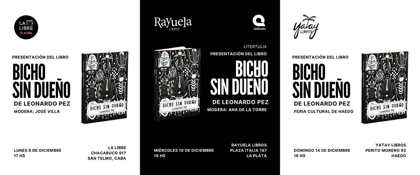 El lunes 8, desde las 17, estaré La Libre (Chacabuco 917, CABA) para una conversación con el poeta José Villa, quien me acompañó en el proceso de corrección de la obra. El martes 10, a partir de las 19, mis poemas surcarán las diagonales platenses hasta aterrizar en Rayuela (Plaza Italia 187, La Plata), con la moderación de la periodista Ana de la Torre. Finalmente, el domingo 14, Bicho sin dueño será parte de una celebración popular como la Feria cultural de Haedo, que tendrá lugar desde las 16 frente al local de Yatay libros (Perito Moreno 92, Haedo). En todas las actividades la entrada es libre y gratuita.